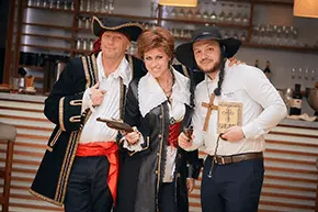 К базовым атрибутам гости получат дополнительный реквизит для каждого персонажа — элементы костюмов и аксессуары, дополняющие образ. Борода или усы для лихого пирата, курительная трубка и монокль для детектива, монашеская ряса и крест для священника.